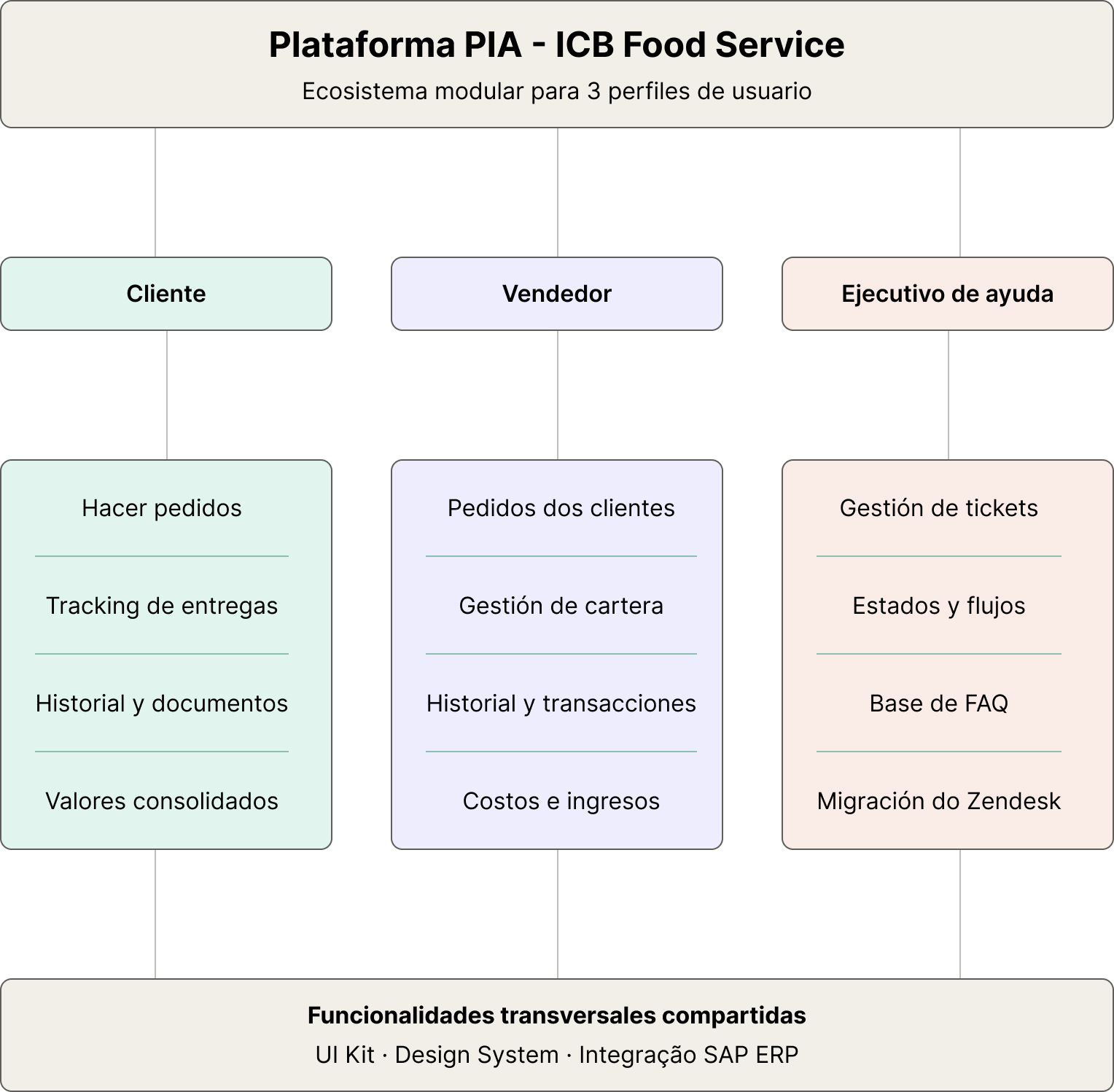 Además, el proyecto presentaba un desafío estructural importante: la plataforma debía responder a 3 perfiles con necesidades completamente distintas — clientes, vendedores y ejecutivos del centro de ayuda — cada uno con funcionalidades propias que debían convivir con elementos transversales del sistema.